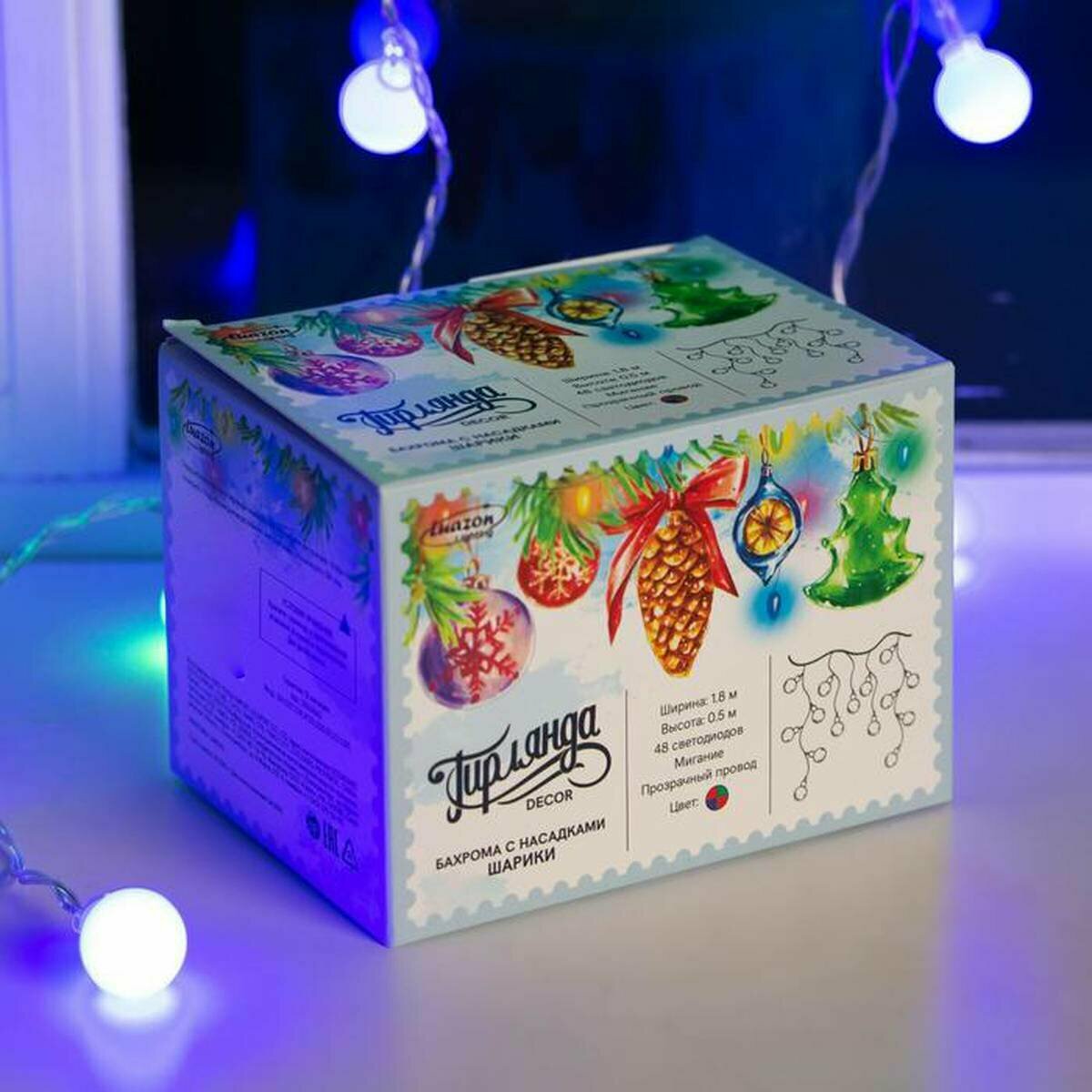 Гирлянда «Бахрома» 1.8 × 0.5 м с насадками «Шарики», IP20, прозрачная нить, 48 LED, свечение мульти (RG/RB), мигание, 220 В