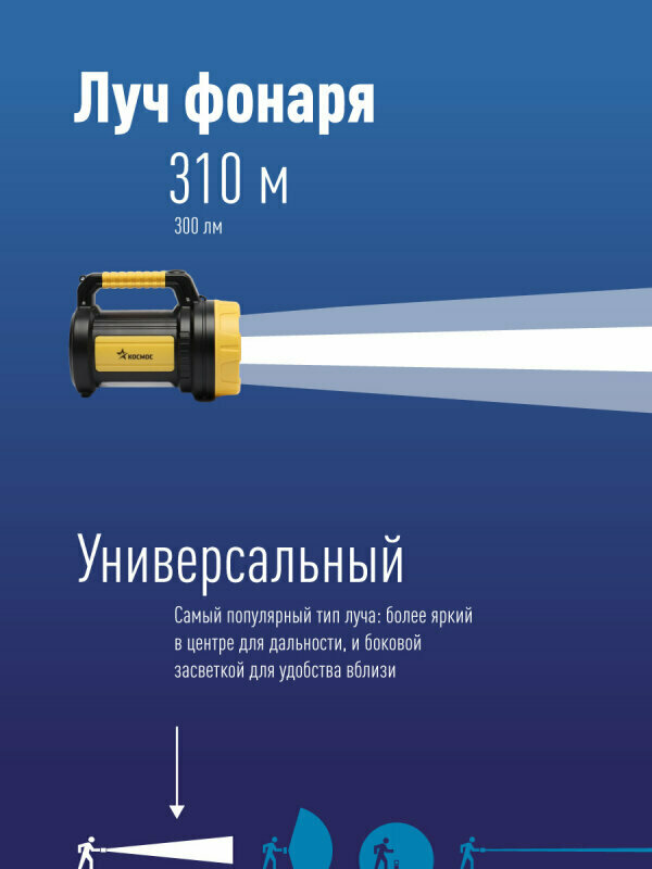 Космос фонарь-прожектор 2005W_Ex (акк.4V2Ah) LED 5W(300lm) +10W(380lm), жел./пласт 3 реж.з/у 220/12в (арт. 646375)