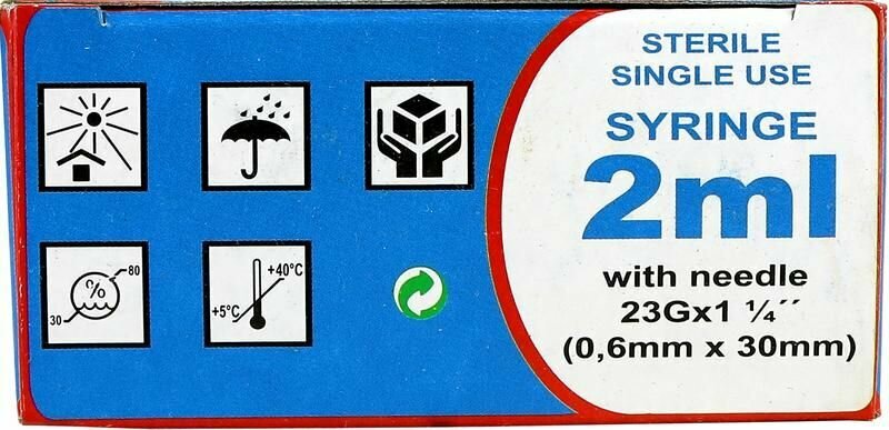 Шприц 2 мл. трехкомпонентный одноразовый, стерильный с надетой иглой 0,6 мм x 30 мм - 23G SFM, Германия, 100 штук