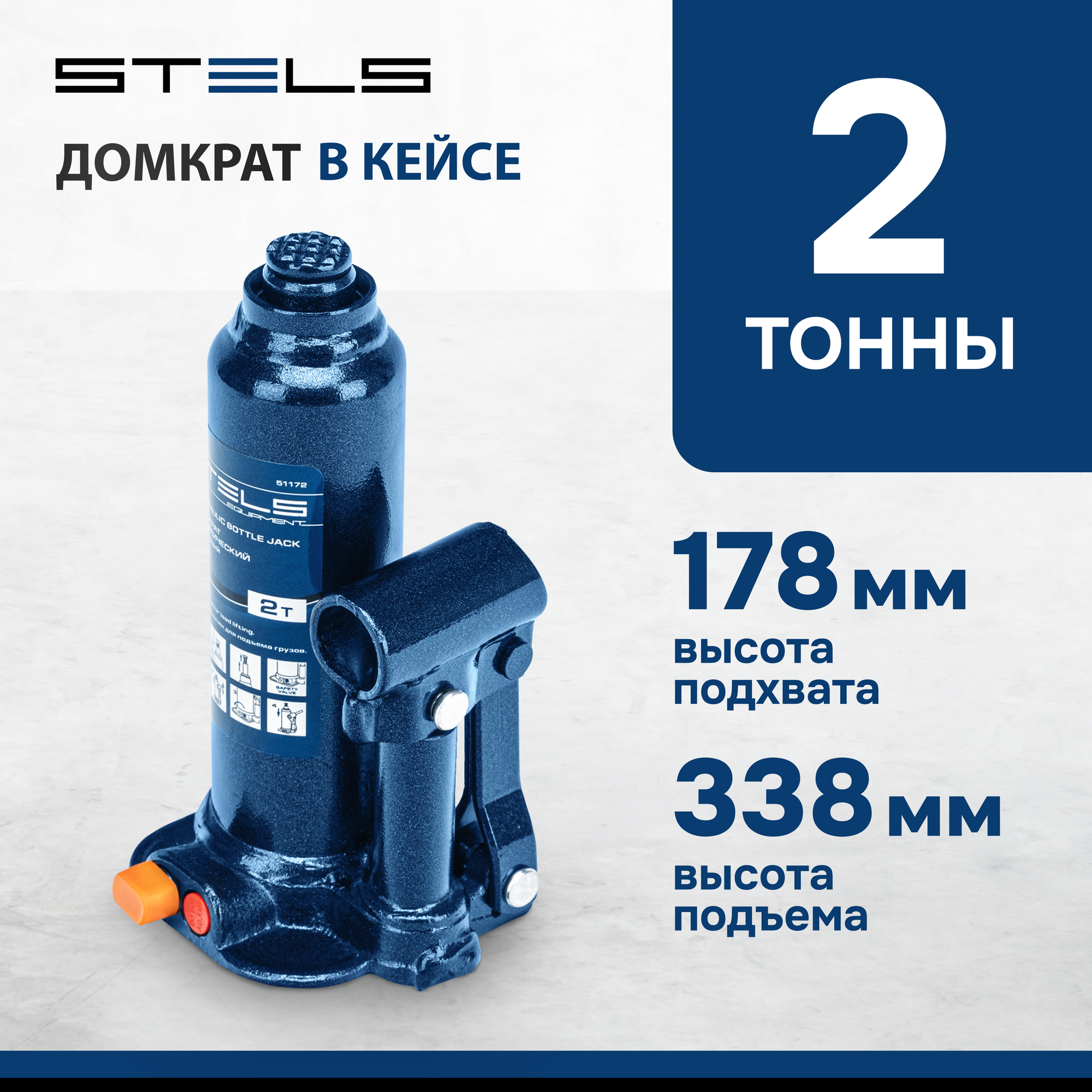 Купить Домкрат гидравлический бутылочный, 2 т, h подъема 178-338 мм, в пластиковом кейсе Stels [51172]