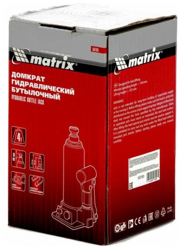 Домкрат гидравлический бутылочный, 4 т, h подъема 194-372 мм Matrix 50763 MATRIX 50763