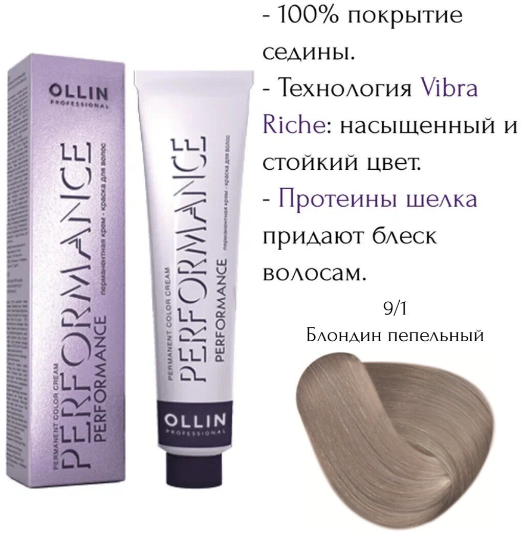 OLLIN, PERFORMANCE, Перманентная крем-краска №10/1, светлый блондин пепельный, 60 мл