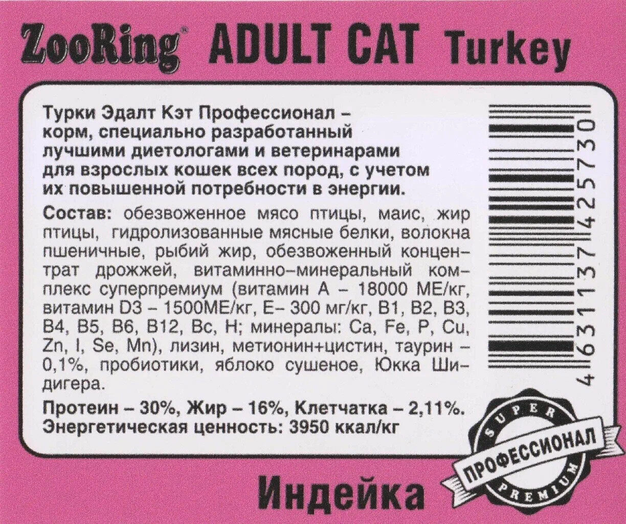 Корм для взрослых кошек, ZooRingЗооРинг, Adult Cat Turkey (Индейка), 1,5 кг