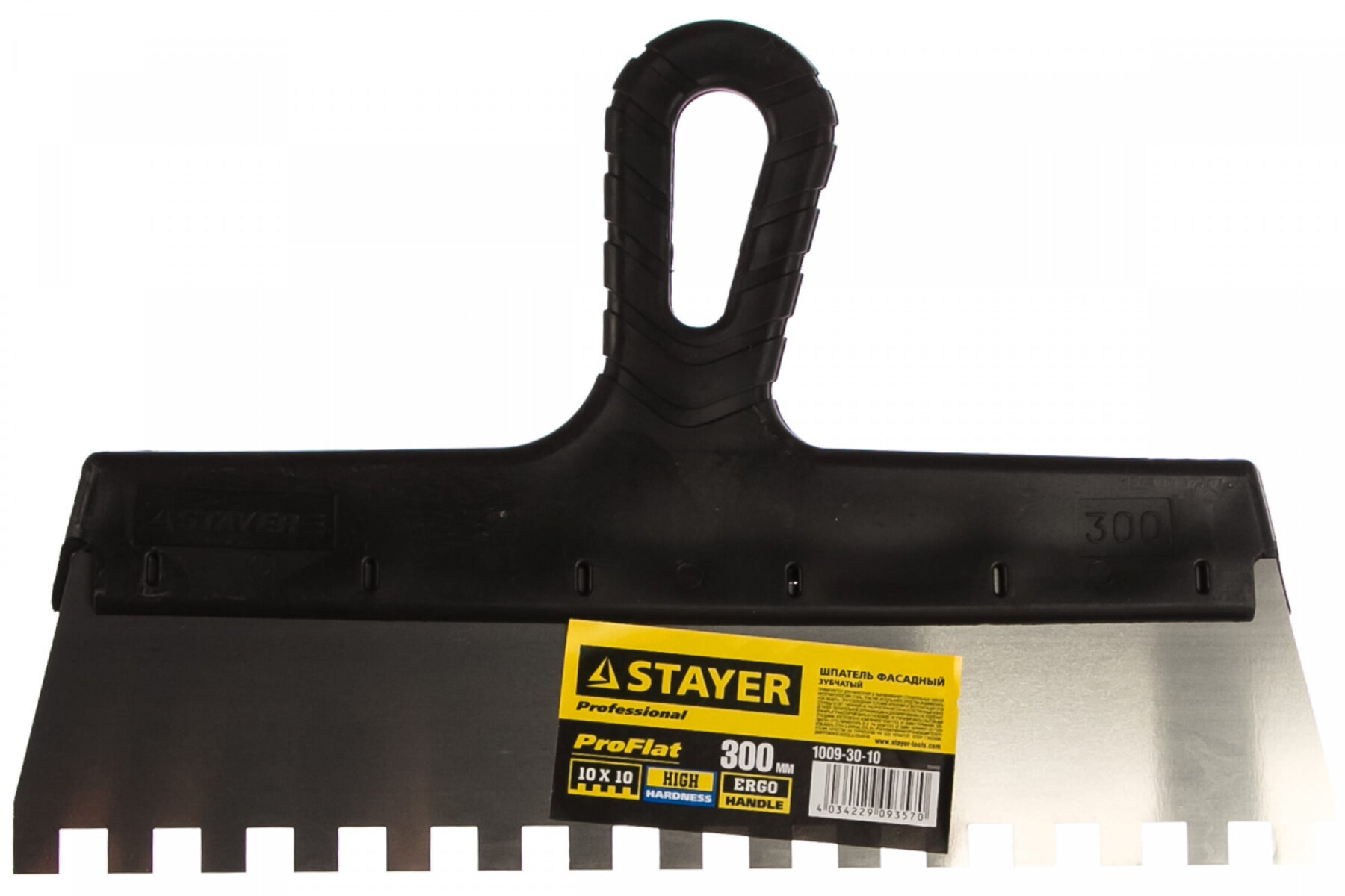 STAYER ProFLat 300 мм, зуб 10х10 мм, пластиковая ручка, зубчатый, нержавеющий, Фасадный шпатель, PROFESSIONAL (1009-30-10)
