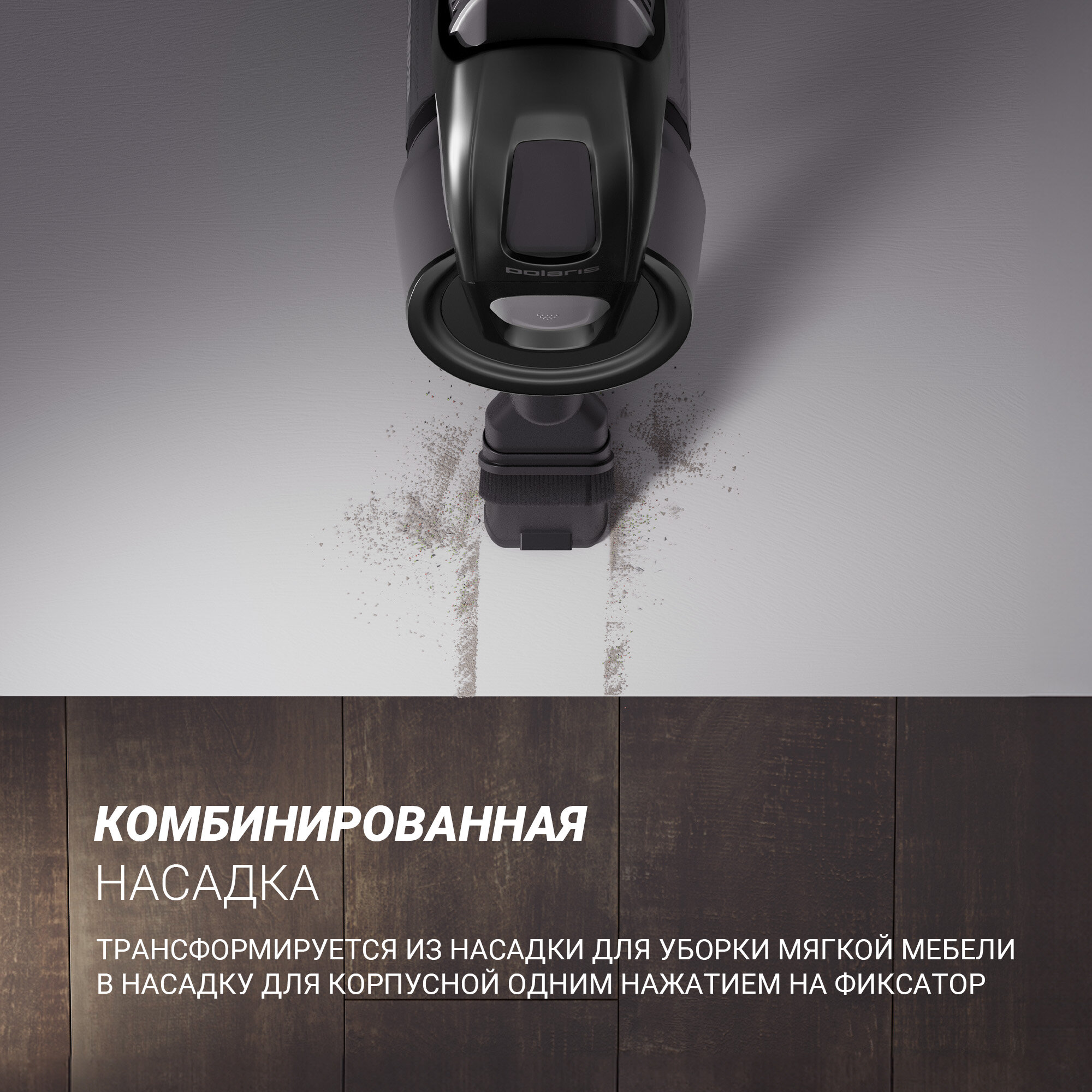 Вертикальный беспроводной пылесос Polaris PVCS 1101, 25,2 В, 2,5 Ач, Li-ion, ЗУ, серебро
