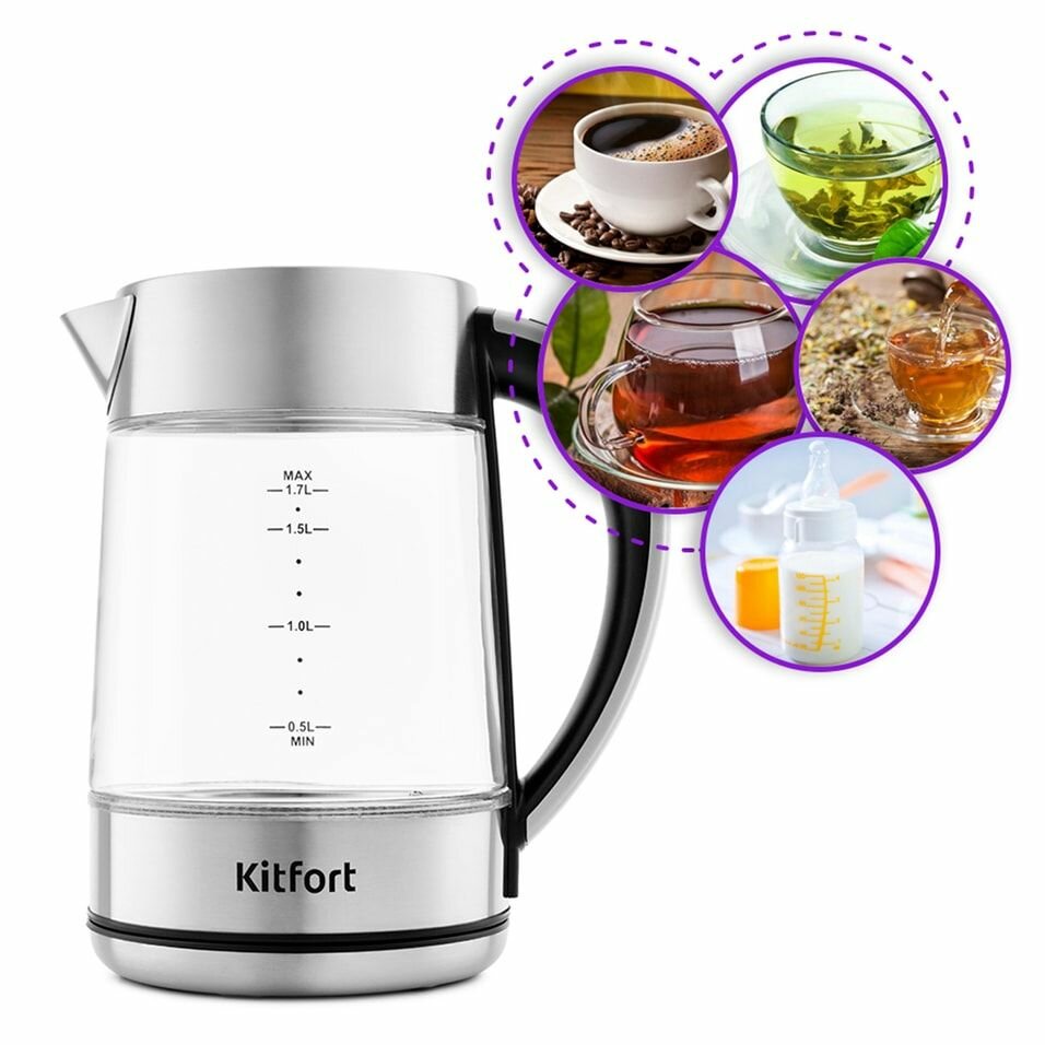 Чайник KITFORT КТ-690, 1,7 л, 2200 Вт, закрытый нагревательный элемент, LED дисплей, терморегулятор, стекло, серебро