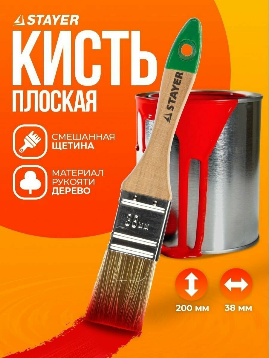 STAYER 01031-38 Кисть плоская ″LASUR-STANDARD″, смешанная (натуральная и искусственная) щетина, деревянная ручка, 38 мм