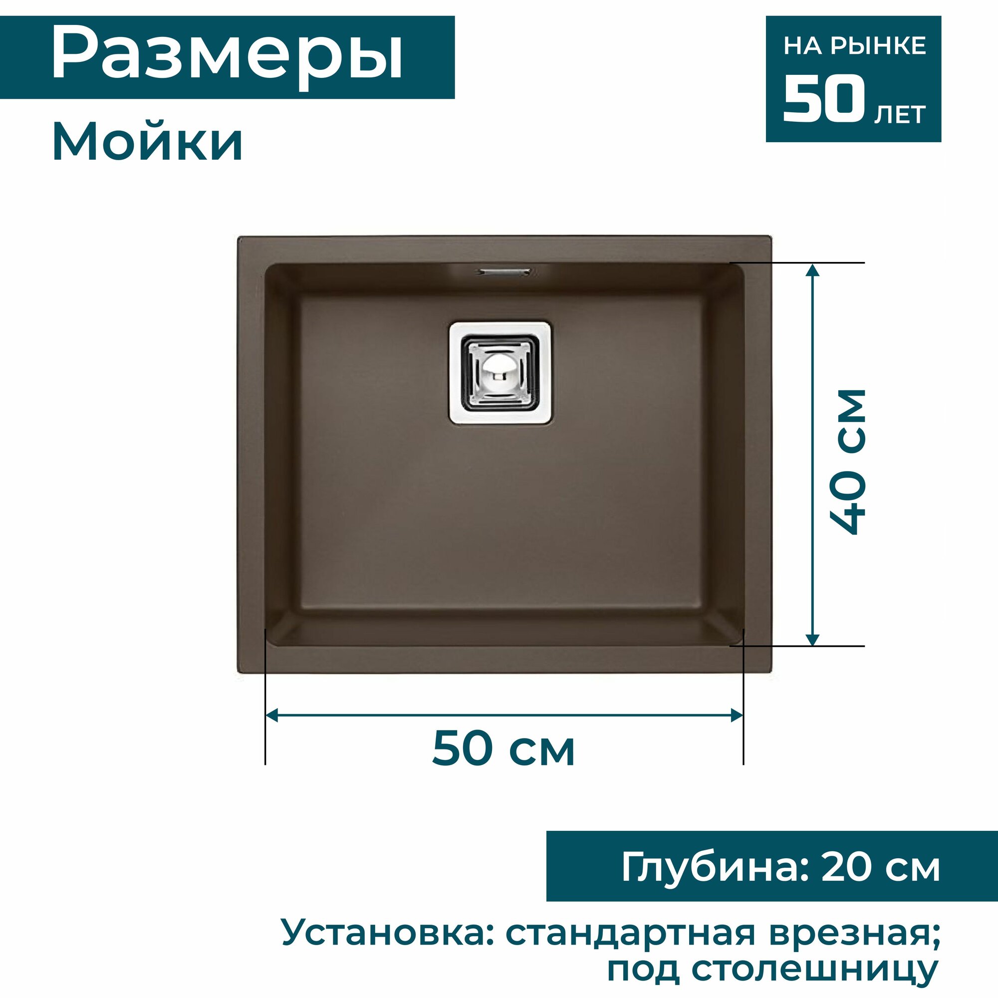 Мойка для кухни каменная врезная под столешницу ALVEUS QUADRIX 50 GRANITAL 56 X 46 X 20 см искусственный камень гранит с сифоном. Цвет коричневый шоколад