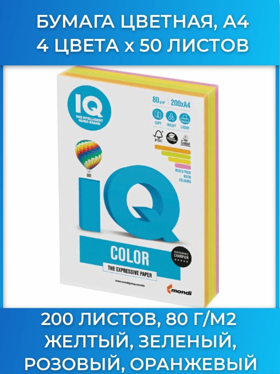 Бумага цветная IQ COLOR (А4,80г,4цв. GN/GB/OR/PI по 50л.) пачка 200л.
