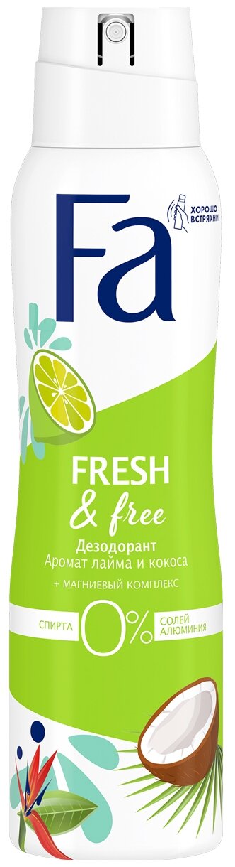 Fa Аэрозоль дезодорант Fresh & Free, аромат лайма и кокоса, магнезиум комплекс, 24 ч, 150 мл