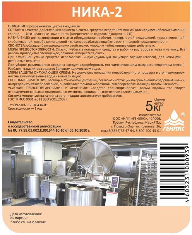 Ника 2 Средство для дезинфекции поверхностей и оборудования на предприятиях мясной, молочной и хлебопекарной промышленности, 5 л