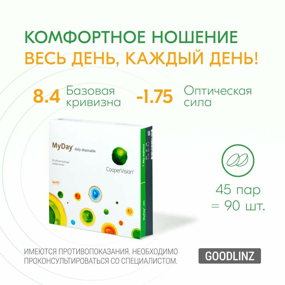 "Контактные линзы CooperVision MyDay Daily Disposable (90 линз) -1.75 R 8.4, однодневные, прозрачные"