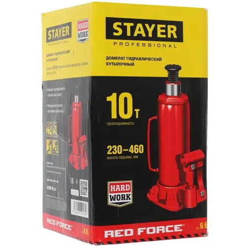 STAYER RED FORCE 10т 230-460мм домкрат бутылочный гидравлический (43160-10_z01)