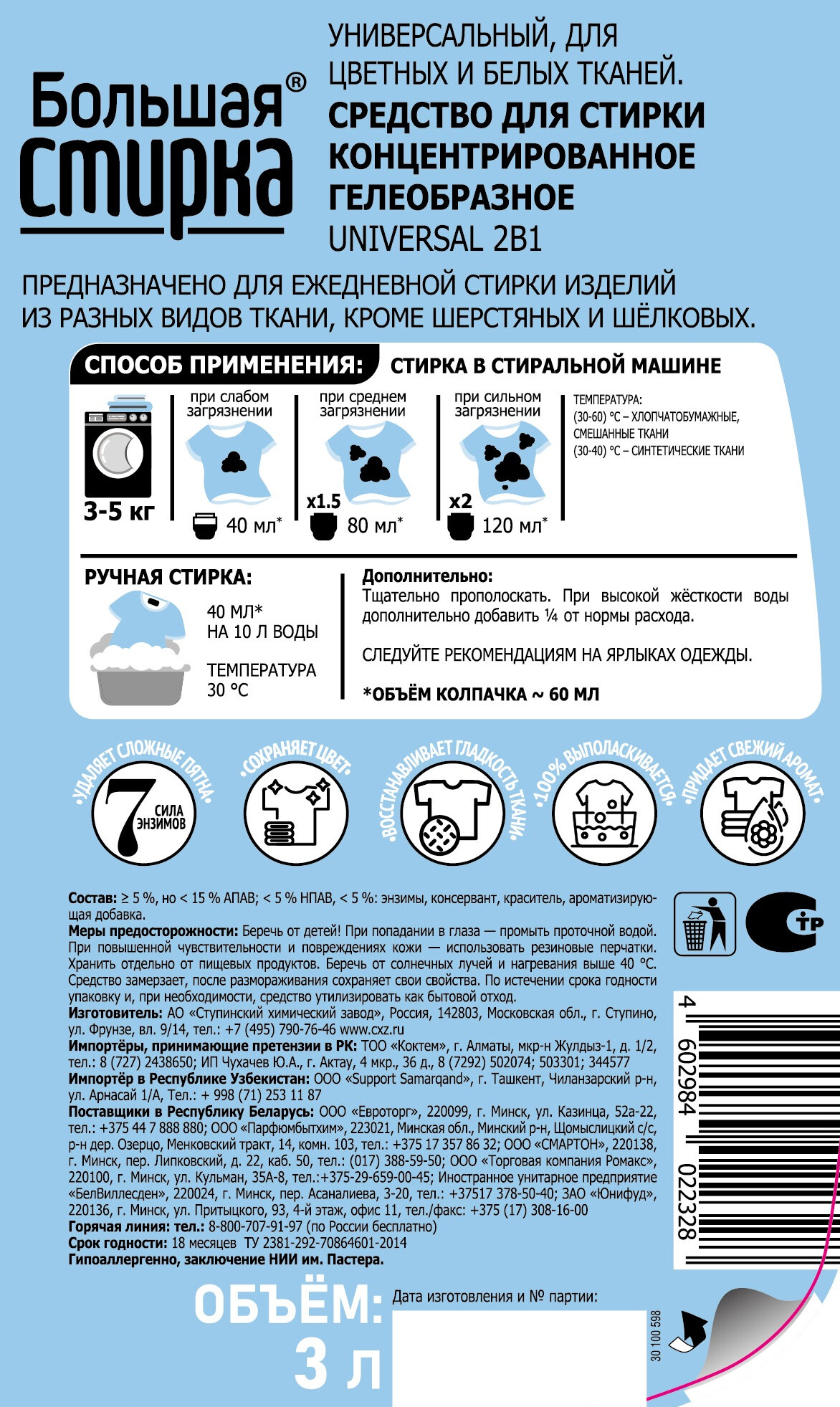 Кондиционер для белья Большая стирка universal 2 в 1 для белых и цветных тканей, гель-концентрат 3л / ополаскиватель для стирки