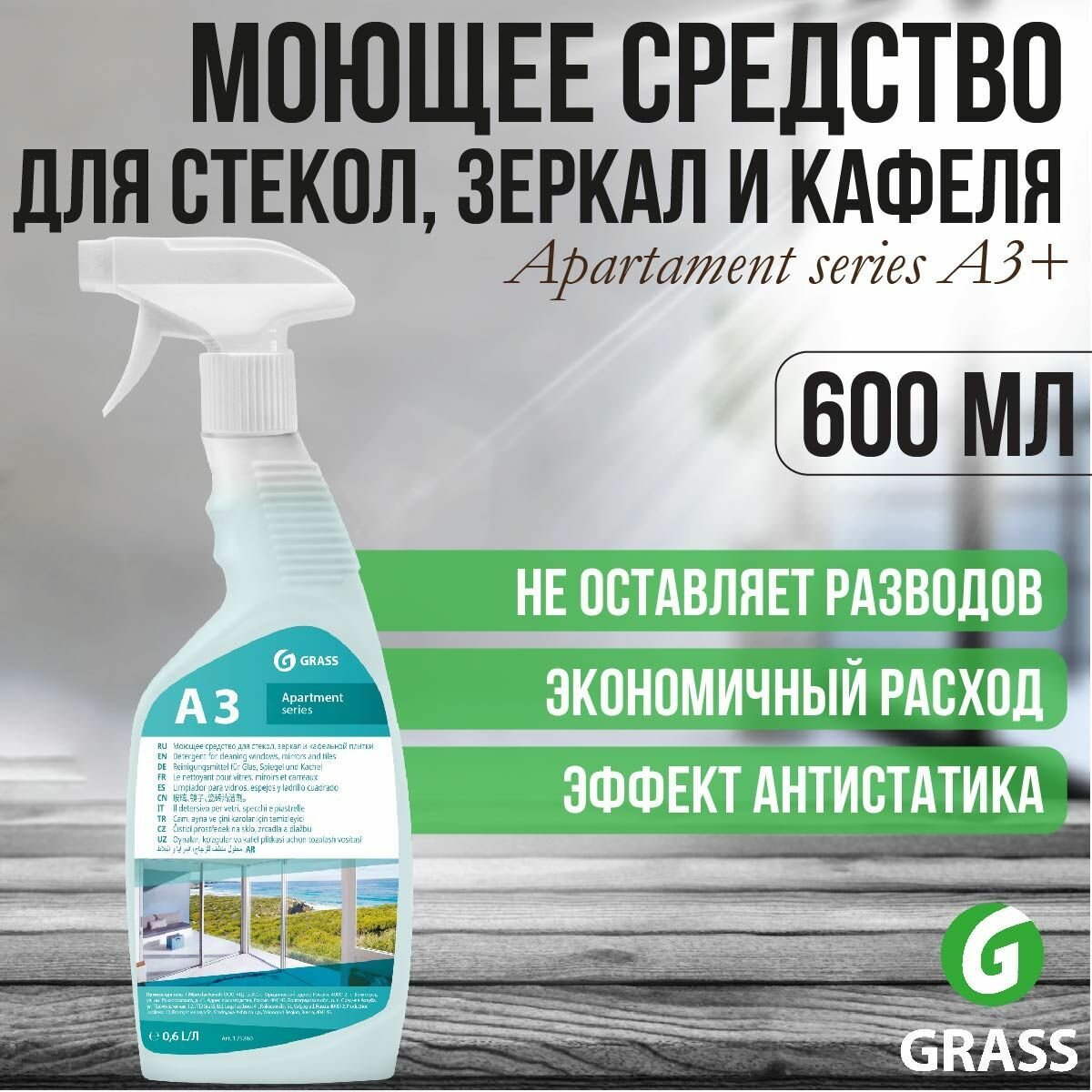 GRASS Моющее средство для стекол, зеркал и кафельной плитки Apartament series А3, 600 мл