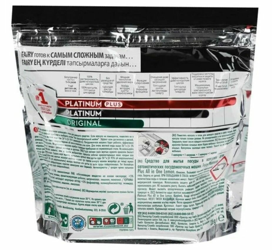 Капсулы для посудомоечной машины Fairy Platinum+ Все-в-Одном капсулы Лимон, 40 шт., 0.71 кг, пакет