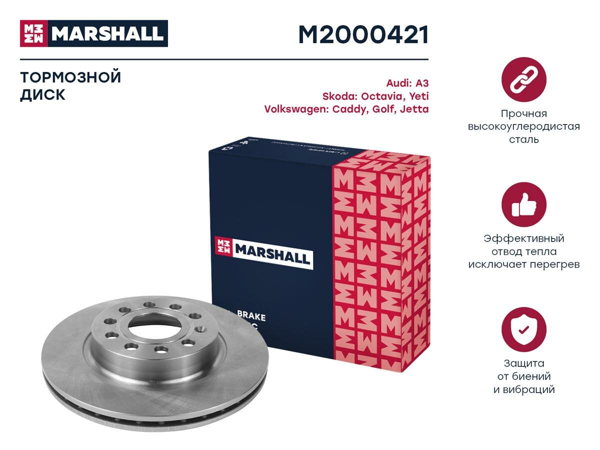Тормозной диск Skoda Octavia (1Z) 04-, VW Golf V (1K), VI (5K) 03-, VW Jetta III (1K2), IV (162,163, AV) 05- передн. (M2000421) MARSHALL M2000421