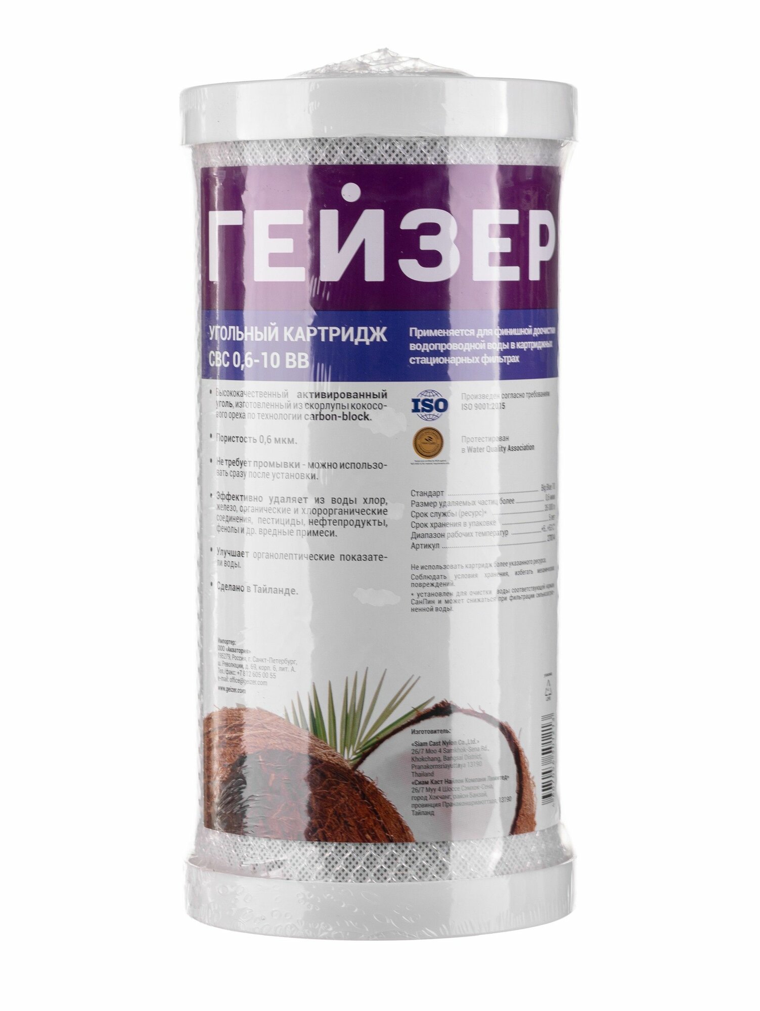 Картридж Гейзер CBC 0.6 - 10BB для магистральных фильтров из кокосового активированного угля для кондиционирования воды и глубокой очистки воды от хлора, органических и хлорорганических соединений
