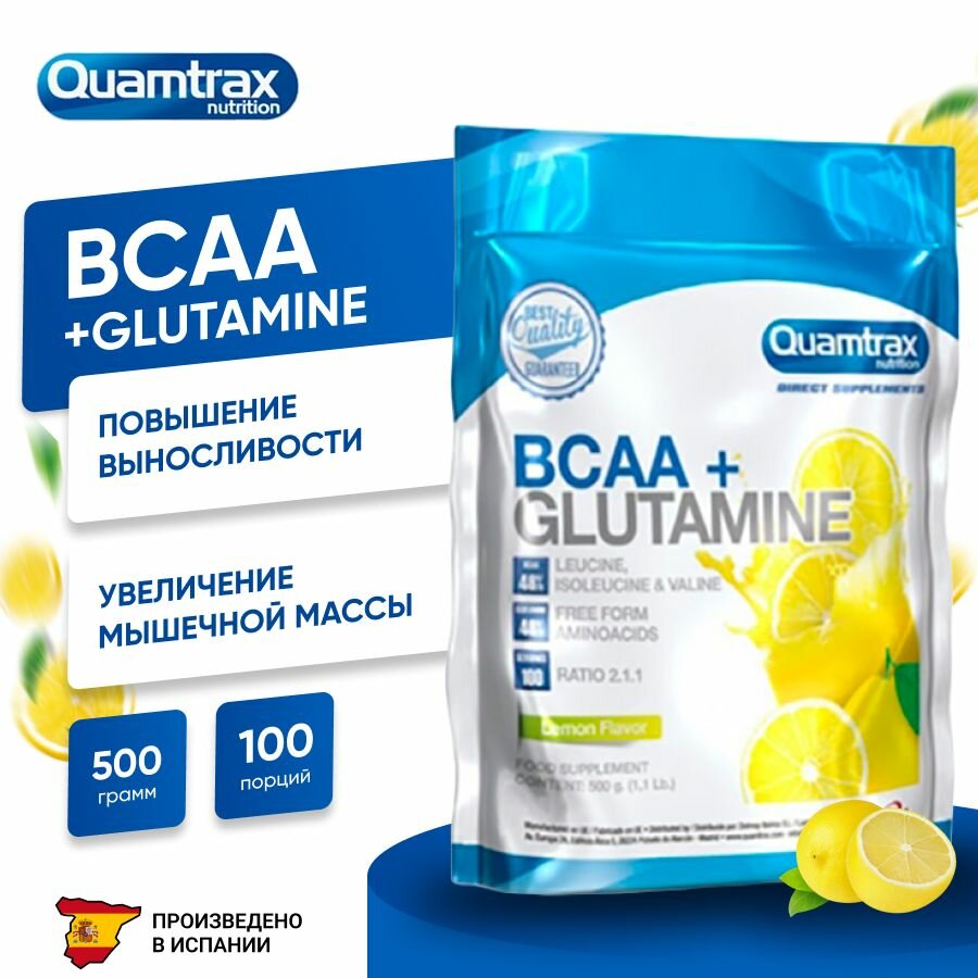 BCAA спорт питание порошок 500 гр (100 порций), Quamtrax Аминокислоты BCAA 2:1:1 + глютамин для роста мышц, вкус: лимон интересное: