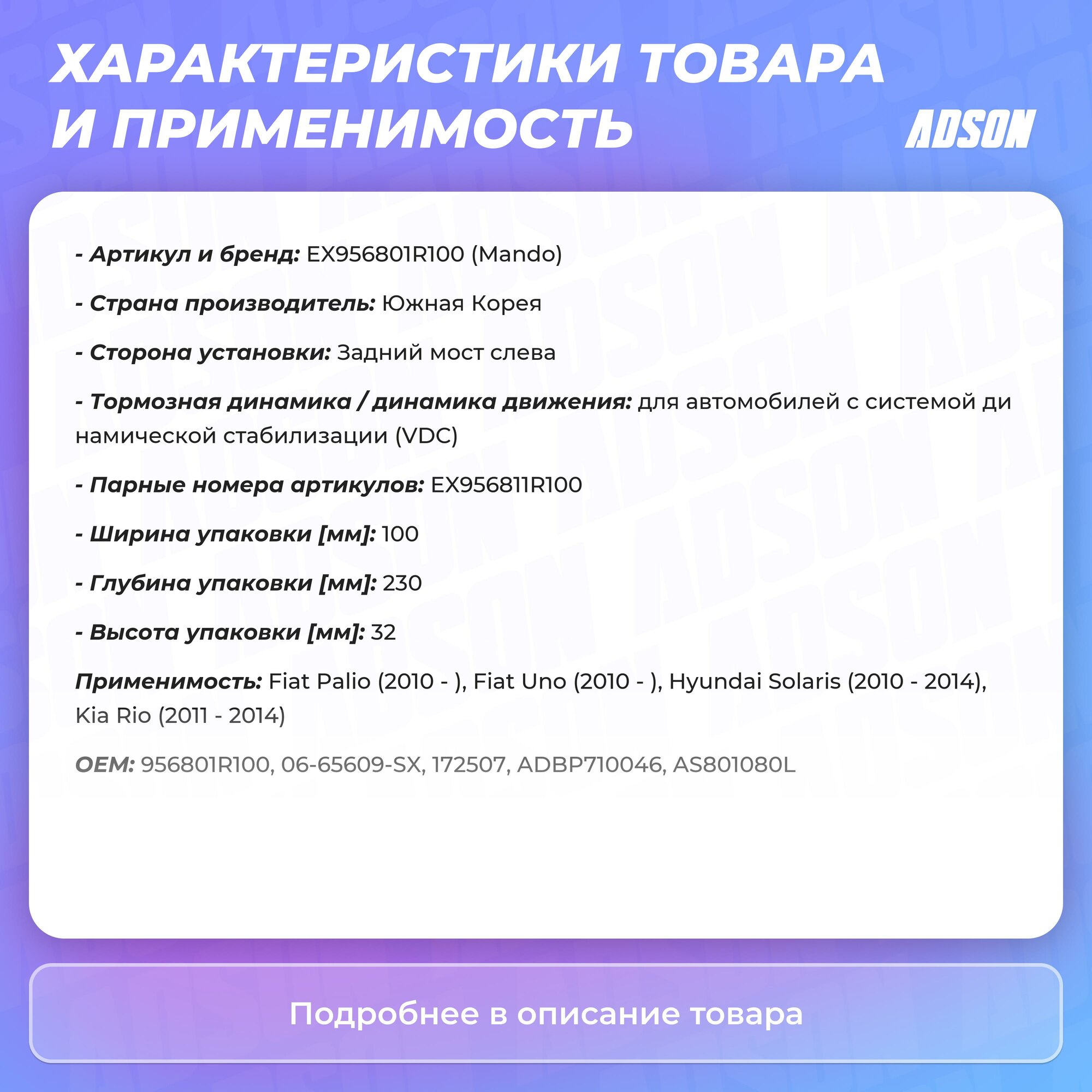 Датчик abs hyundai solaris 10-/rio iv 11- зад.лев., mando, ex956801r100