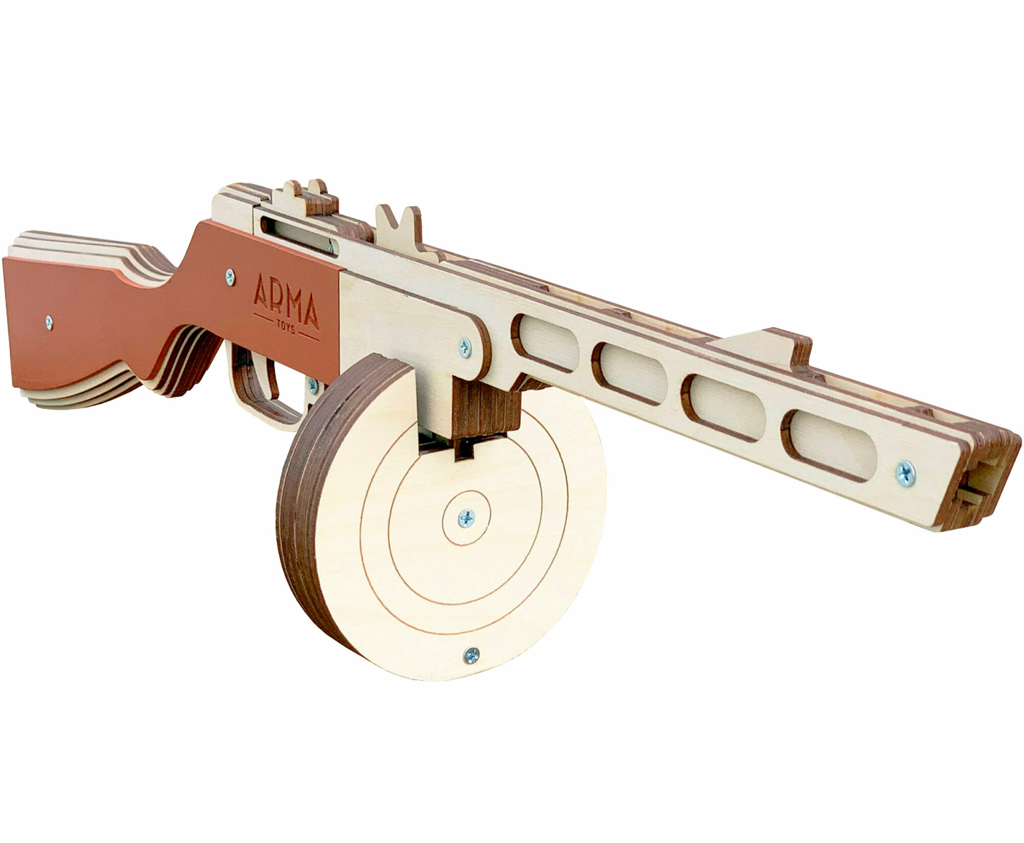 Деревянный автомат-резинкострел ППШ от ARMA. TOYS, фрагментарно окрашенный, со съемным магазином и стрельбой очередями