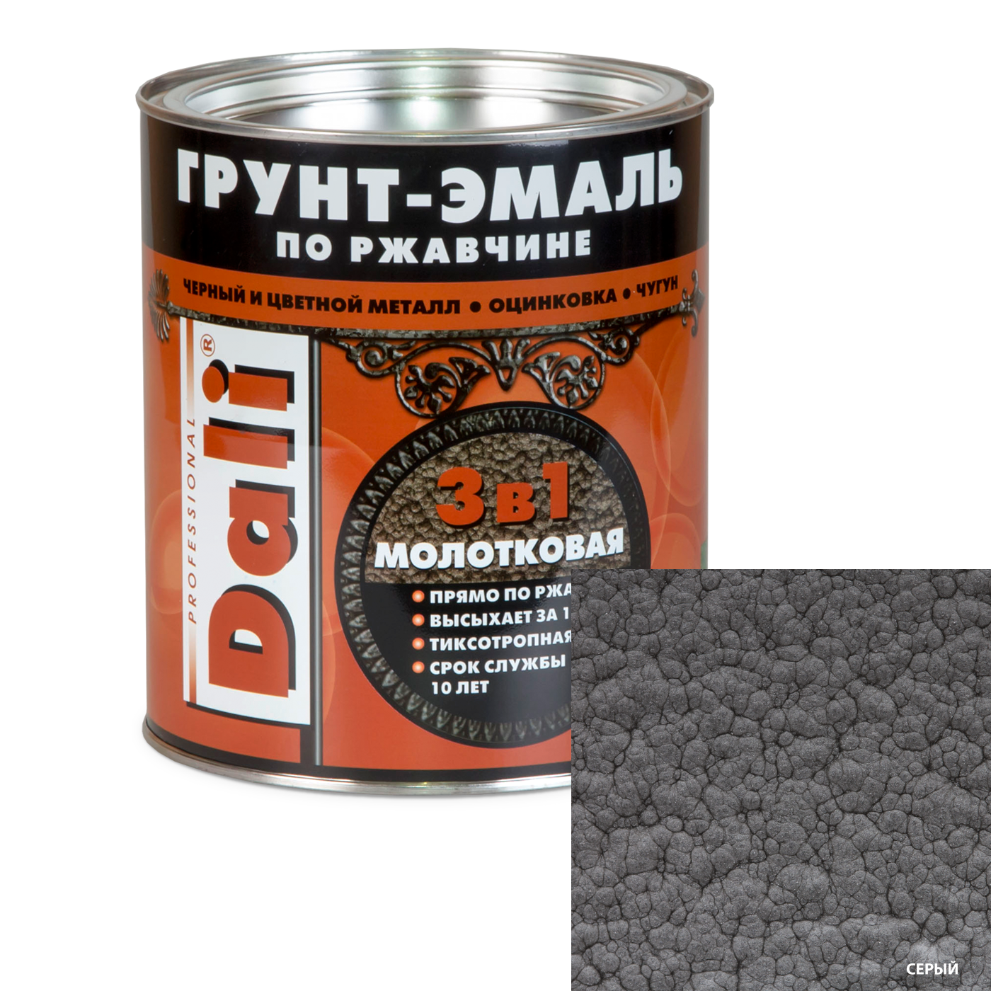 Dali / Дали Грунт-эмаль по ржавчине 3 в 1 молотковая алкидная серая 10л