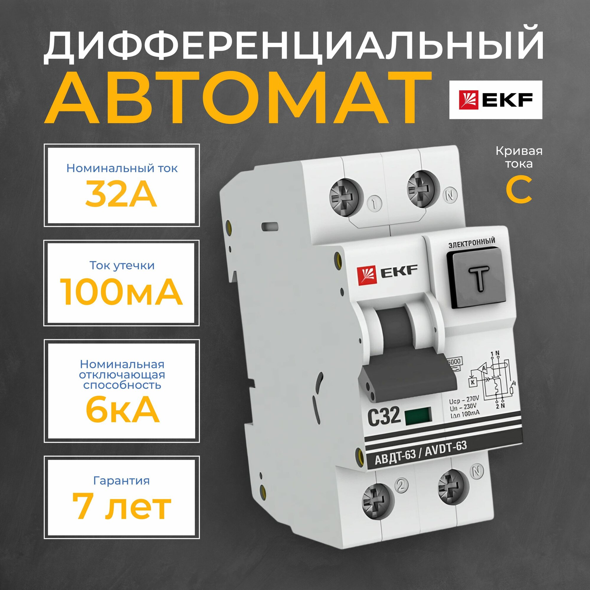 Дифференциальный автоматический выключатель EKF PROxima АВДТ-63, 32А, С, 100мА, тип A, 6кА, электронный