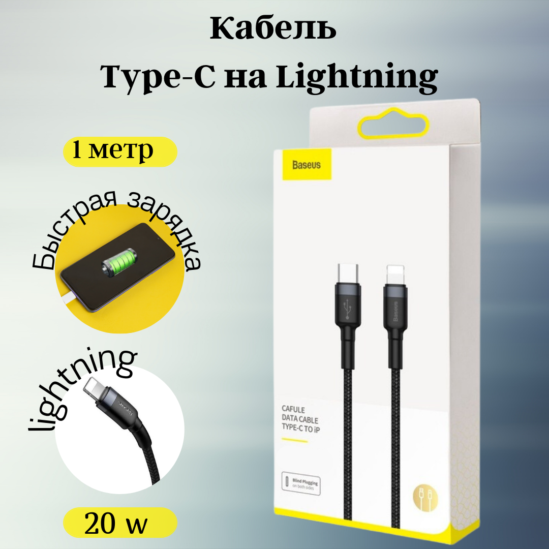 Кабель 1м USB Type-C (m) - Lightning (m) Baseus Cafule Cable - Черный/Серый, для apple, iphone