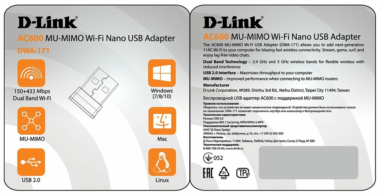 Wi-Fi адаптер D-Link DWA-171 DWA-171/RU/D1A USB 2.0 среда передачи данных Wi-Fi 600Mbps 2.4 GHz,5.0 GHz GHz 802.11a,802.11ac,802.11b,802.11g,802.11n