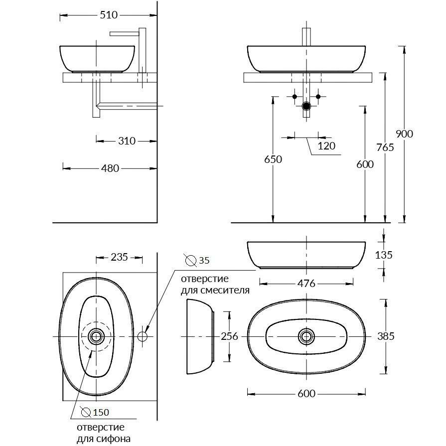 Раковина PLAZA 60х40 cм накладная с отверстием под смеситель