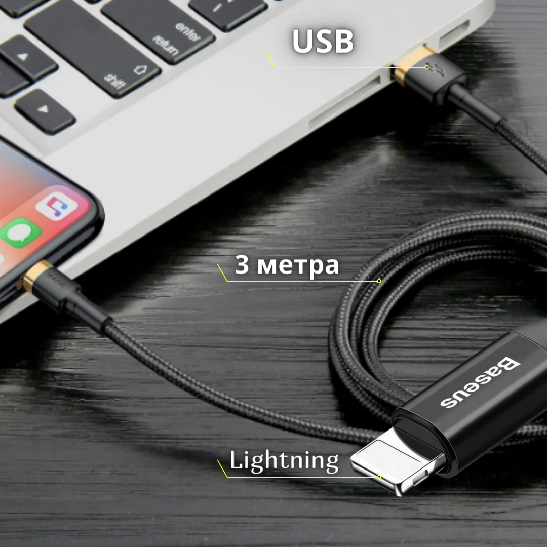 Кабель зарядки Apple Lightning 3m, Baseus Cafule Cable 2A, черный с серым