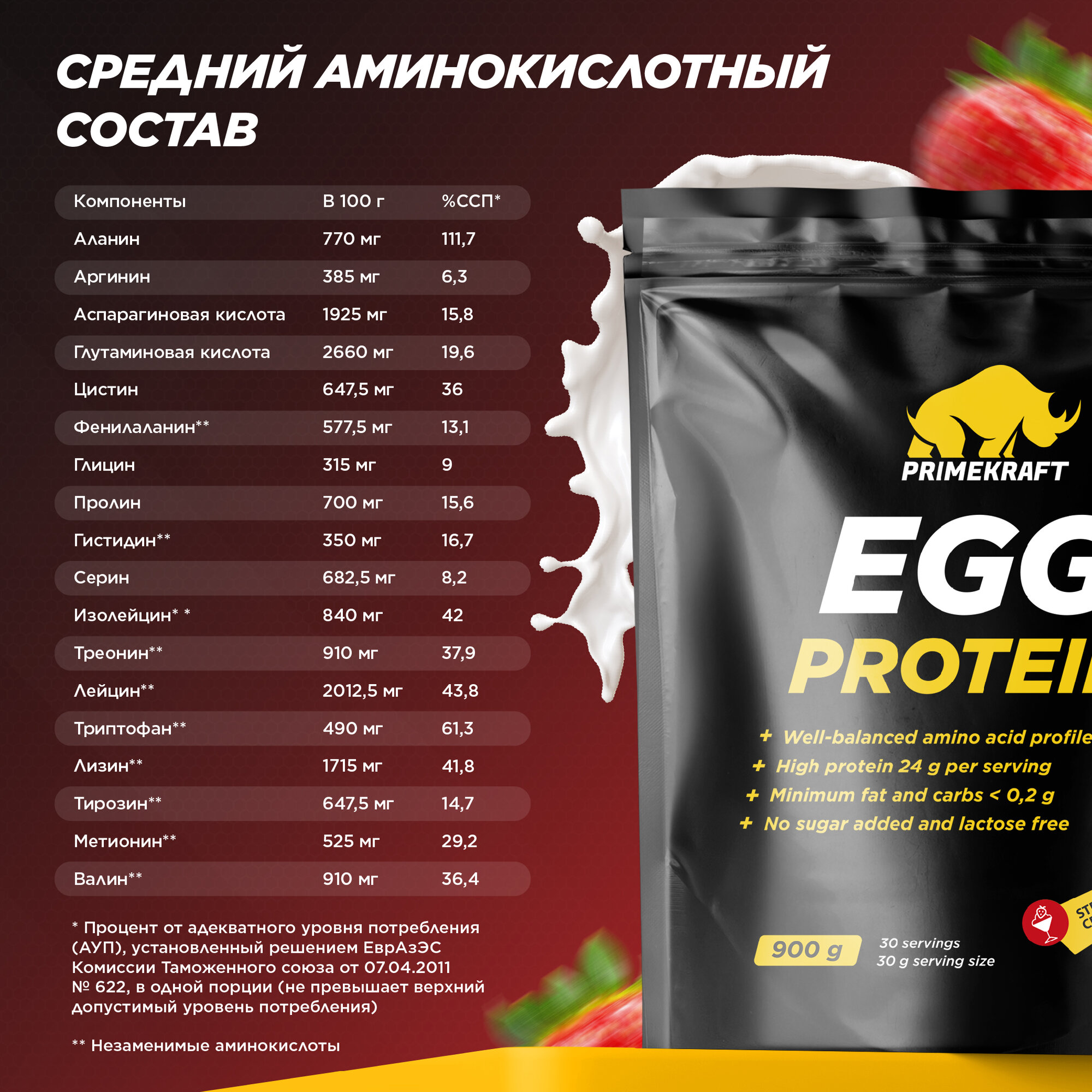 Протеин Prime Kraft СПП «Яичный протеин» (Egg Protein) со вкусом: «Клубника-сливки»