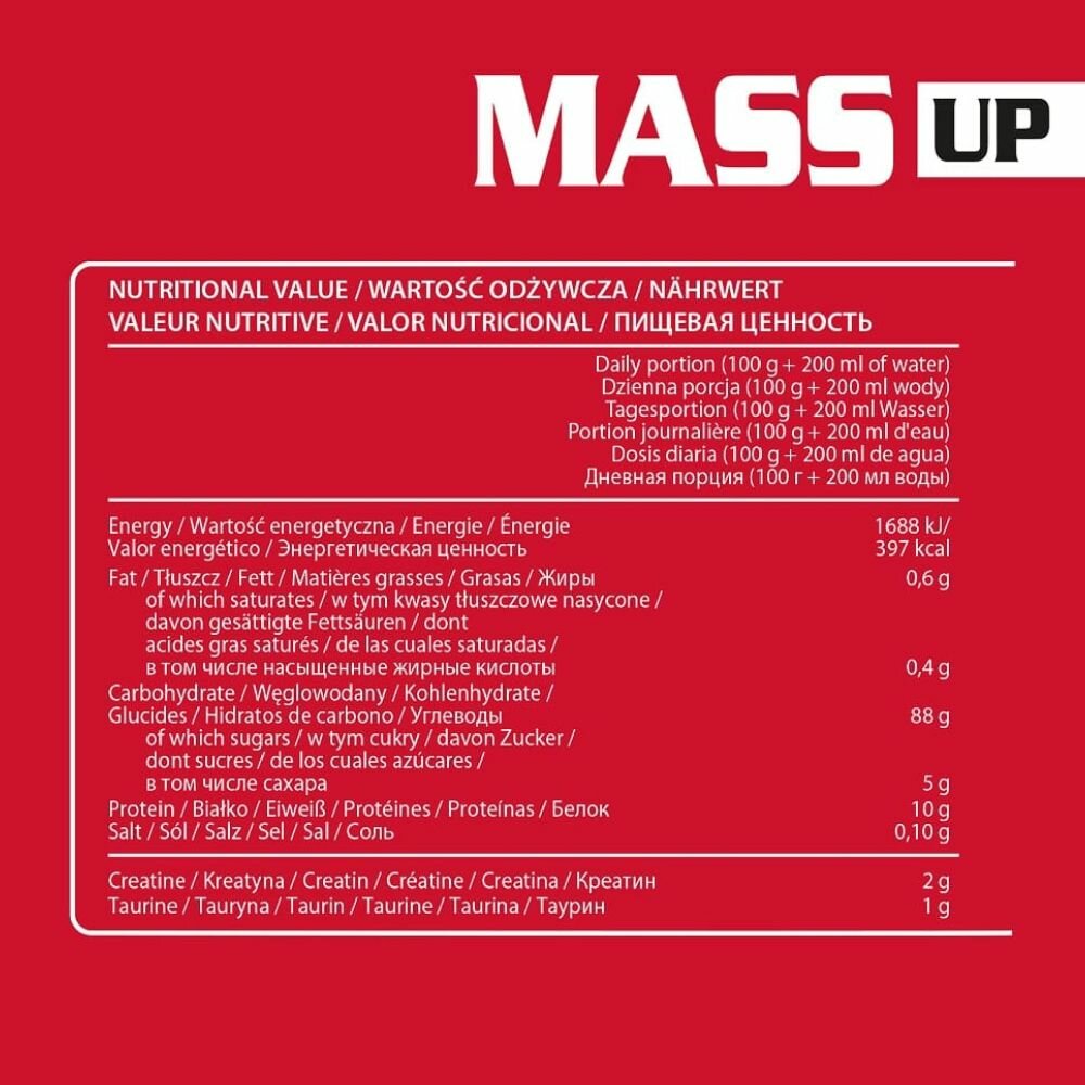 | Состав | мальтодекстрин, глюкоза, концентрат сывороточного белка, моногидрат креатина, таурин, глицин, ароматизатор, загуститель Е466, регулятор кислотности: лимонная кислота (клубника, йогурт-Зауэр вишня и аромат лесных фруктов), красители: Е124 (клубника, йогурт-Зауэр вишня и аромат лесных фруктов)-они могут отрицательно влиять на активность и концентрацию у детей, Е133 (аромат лесных фруктов), Е150с (шоколад и ореховый аромат), Е171 (ваниль, кокос и банан), Е950 подсластитель. Содержит производные молока, яиц, сои, пшеницы; может содержать следы орехов |