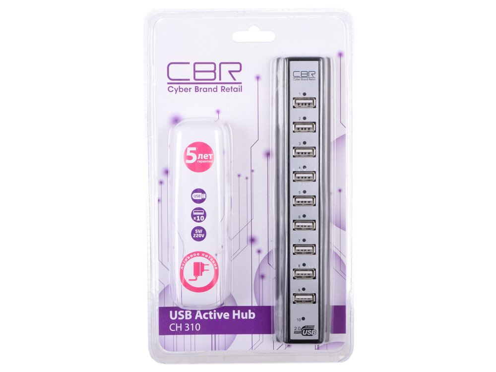 CBR CH-310, USB-концентратор активный, 10 портов, USB 2.0/220В black