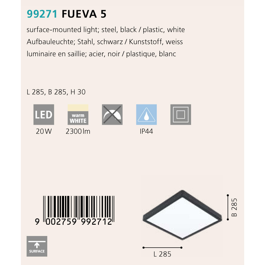 99271 Светодиод. накладной светильник FUEVA 5, 20W (LED), 285х285, H28, 2300lm, 3000K, IP44, сталь,