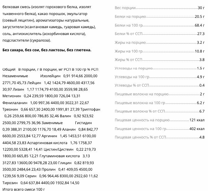 | Состав | белковая смесь (изолят горохового белка, изолят тыквенного белка), олигофруктоза (пищевые волокна из цикория), эмульгатор (соевый лецитин), порошок свеклы, ароматизаторы натуральные, загустители (ксантановая камедь, гуаровая камедь), соль, антиокислитель (аскорбиновая кислота), подсластители (сукралоза) |