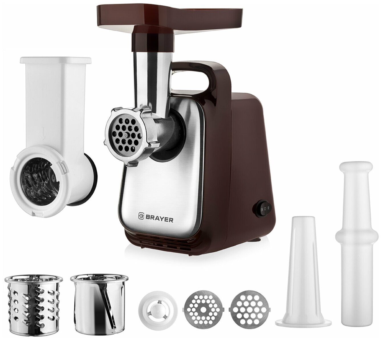 Мясорубка BRAYER BR1601, 1300 Вт, производительность 1,5 кг/мин, металлический шнек, реверс, пластик, коричневая/серебро