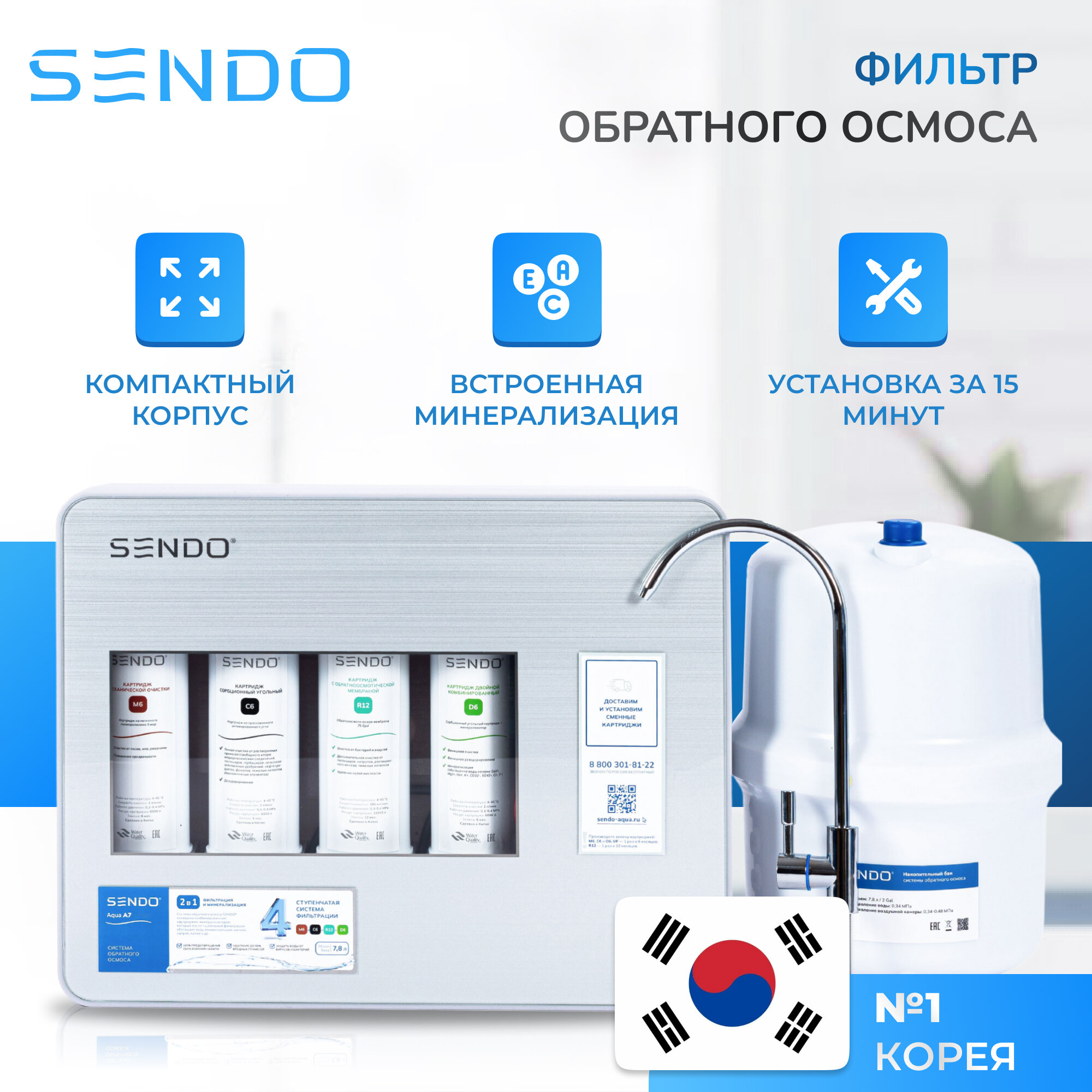 Фильтр обратного осмоса Sendo Aqua A12 + набор сменных картриджей K3+К4 (7 шт.)