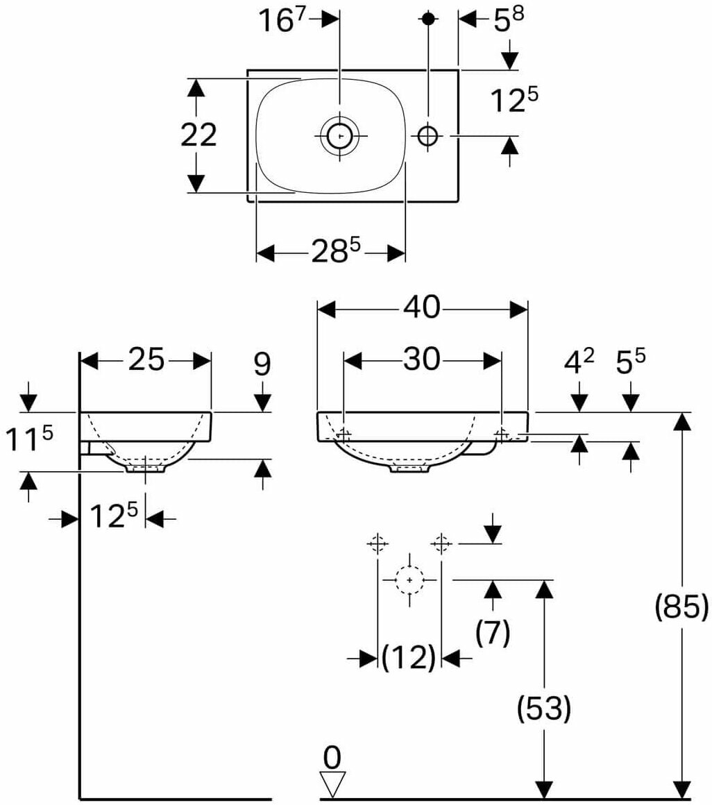 Geberit Acanto Раковина асимметричная, 400 x 250 мм, с отв. под смеситель справа, без перелива