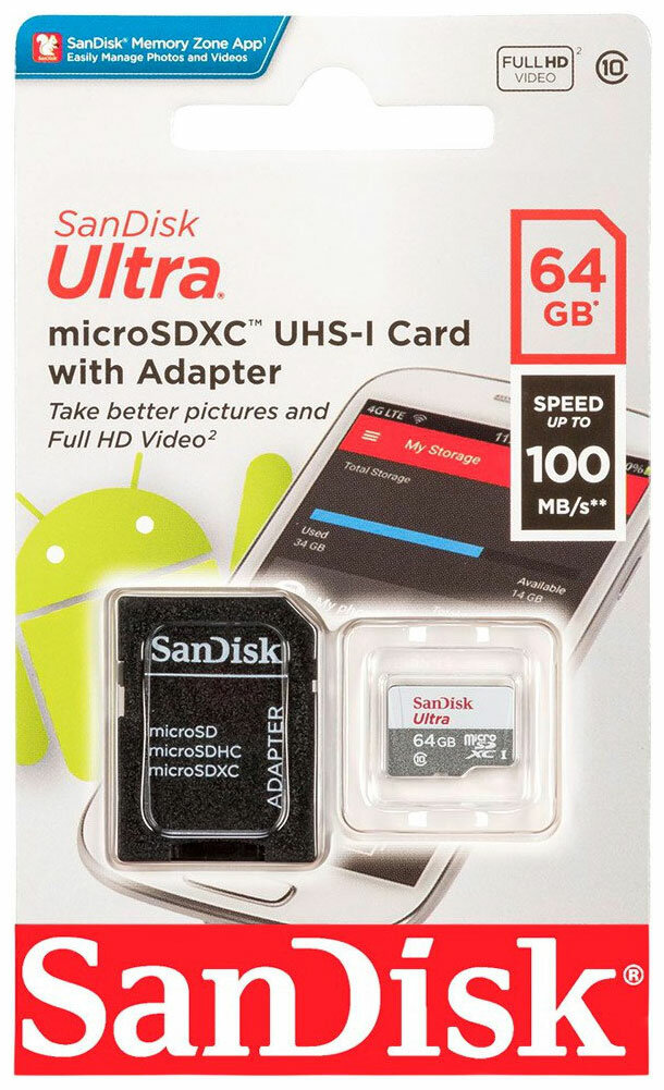 Карта памяти microSDXC SanDisk SDSQUNR-064G-GN3MA 64 Гб класс 10 Ultra UHS-I 100 Мб/с, с адаптером SD