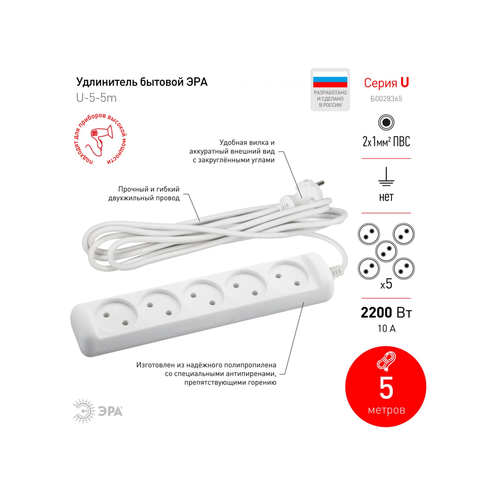 ЭРА U-5-5m Удлин-ль Россия без зазeмл., 2х1мм2, 10А, ПВС, 5гн, 5м Б0028365