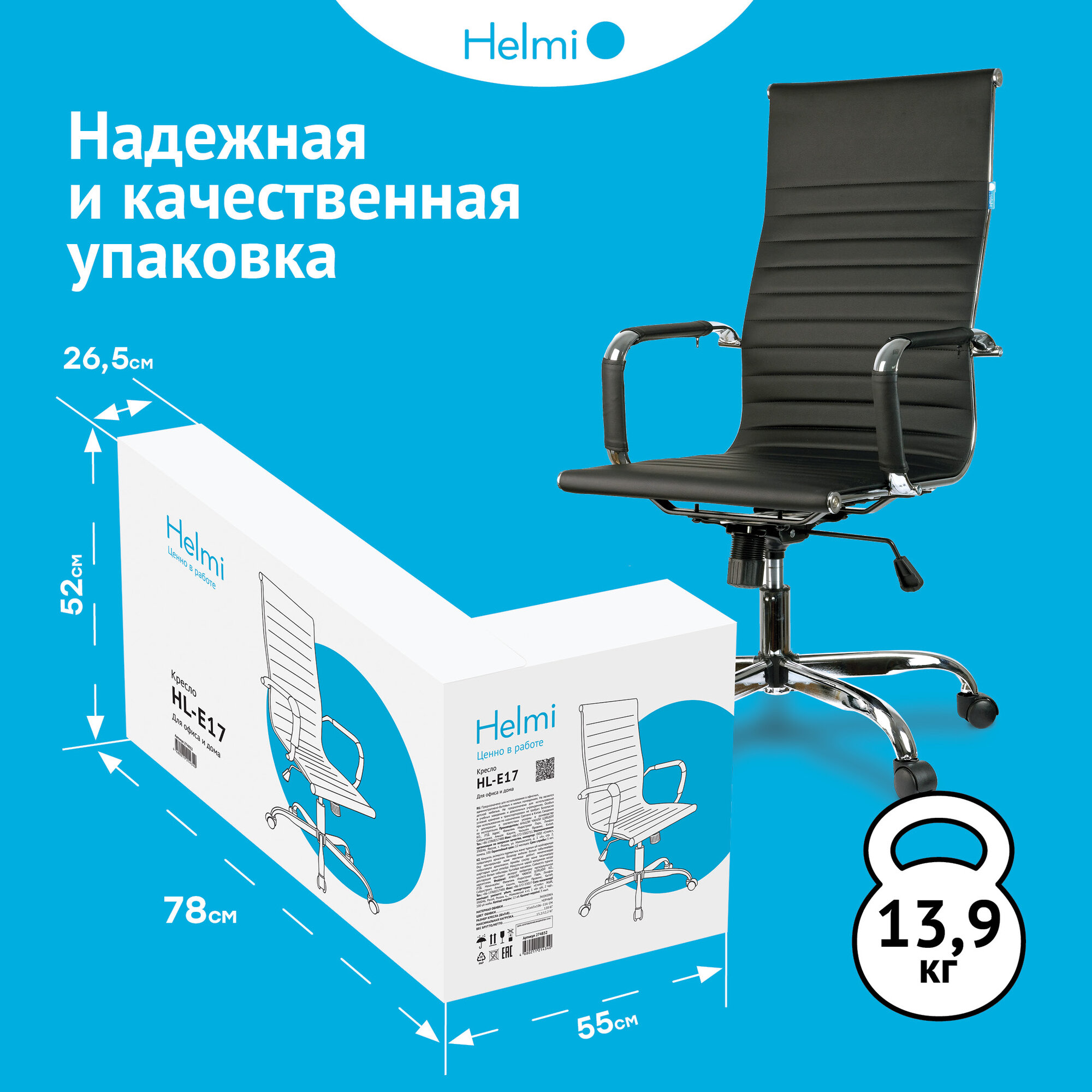 Кресло руководителя Helmi HL-E17 "Slim", экокожа черная, хром 274832