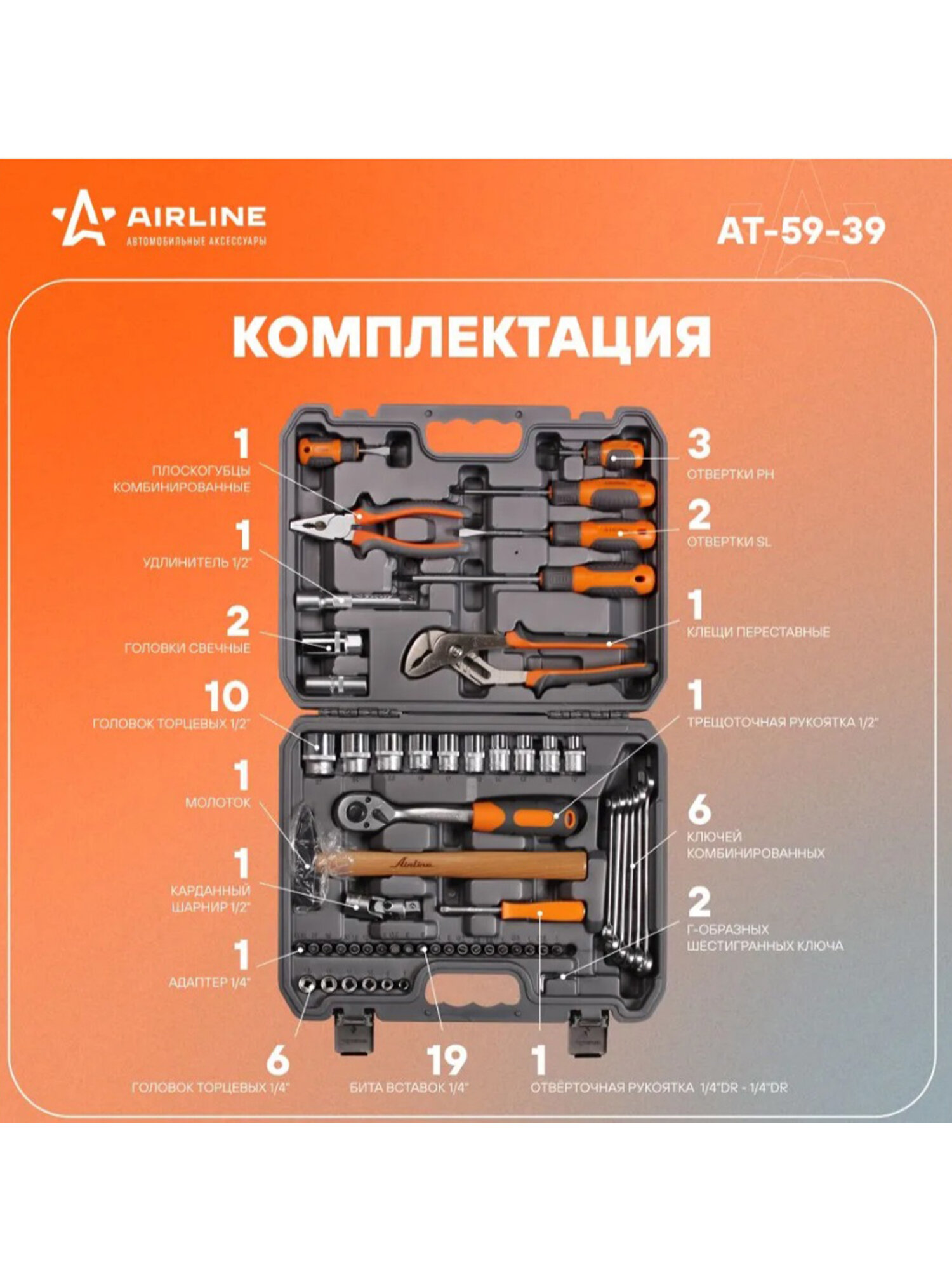 AT5939 AIRLINE Набор инструментов универсальный 59 предметов, пласт.кейс (AT-59-39)