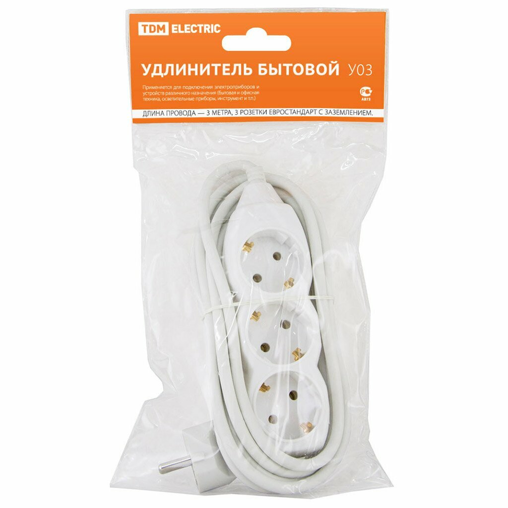 Удлинитель бытовой TDM У03, 3 гнезда, с заземлением, ПВС 3x1, 3м