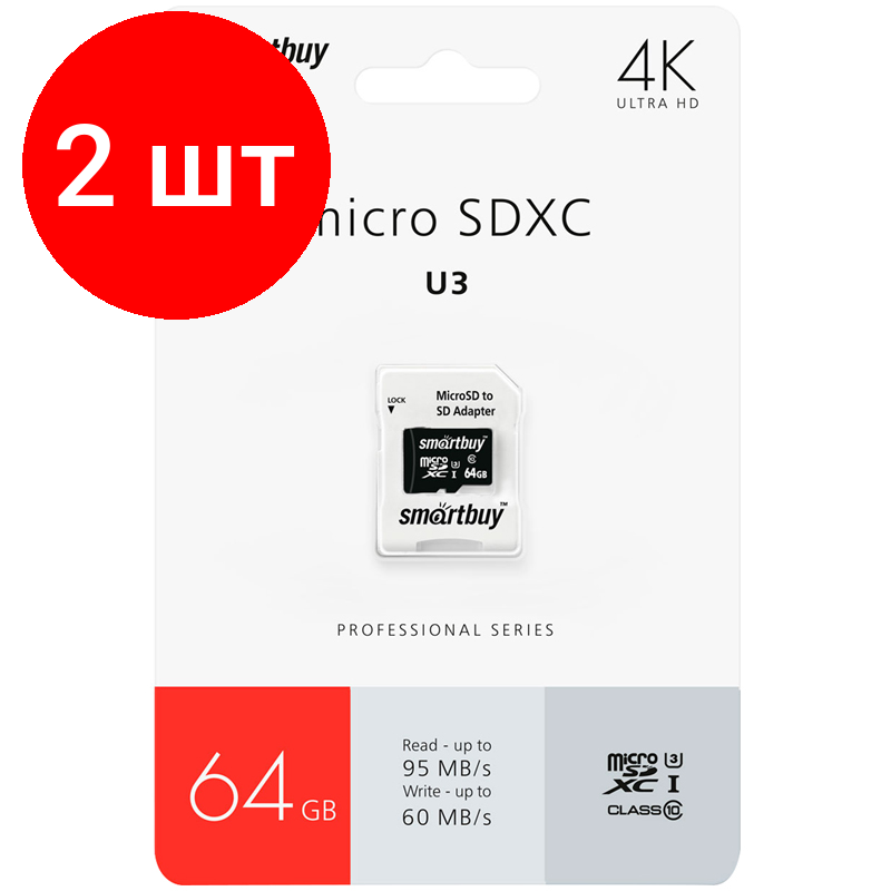 Купить Комплект 2 шт, Карта памяти SmartBuy MicroSDXC 64GB PRO U3, Class 10, скорость чтения 97Мб/сек (с адаптером SD)