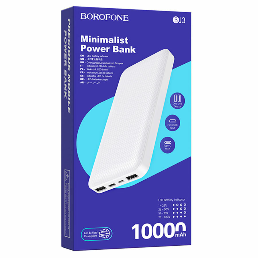 Мобильный аккумулятор BOROFONE BJ3, Minimalist, 10000mAh, пластик, индикатор, 2 USB выхода, микро USB, Type-C , 2.0A, белый (6931474736857)