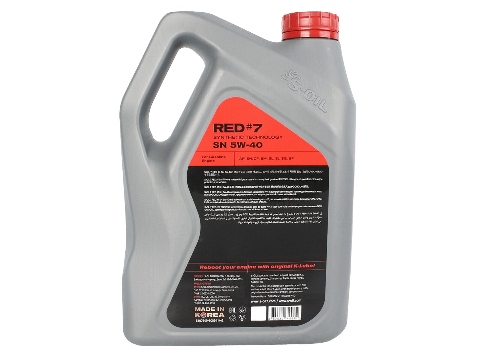 Синтетическое моторное масло S-OIL SEVEN RED #7 SN 5W-40, 4 л, 3.6 кг, 1 шт