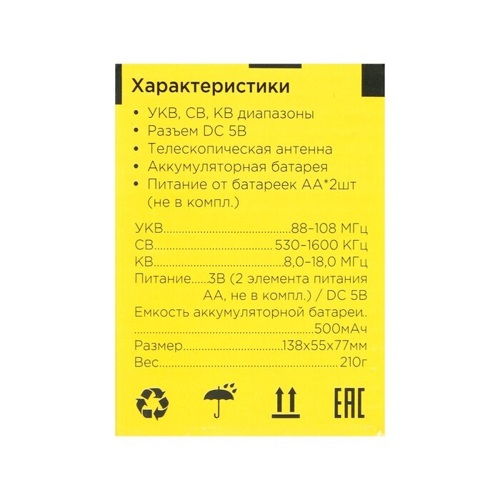 | Дополнительная информация | частоты для каждого диапазона: УКВ (88-108)МГц / СВ (530-1600)КГц / КВ (8.0-18.0)МГц; максимальное время работы от аккумулятора: до 3 часов (на минимальной громкости в режиме радио при хорошем уровне сигнала); среднее время заряда аккумуляторной батареи: 4 часов (зависит от условий эксплуатации) |