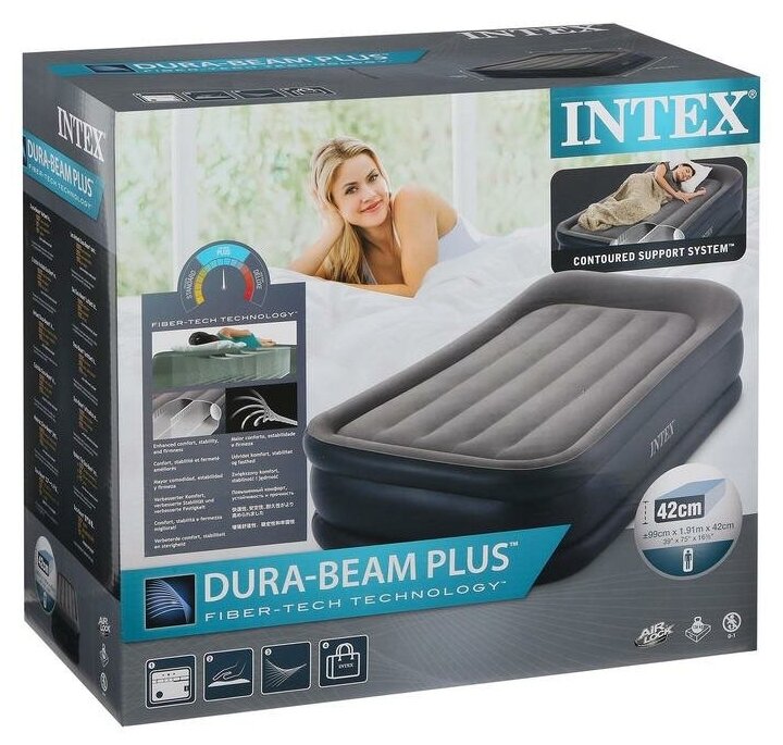 Кровать надувная Deluxe Pillow Res Intex, 191х99х42 см, насос встроенный, электрический, флокированная, с ребрами жесткости, 136 кг