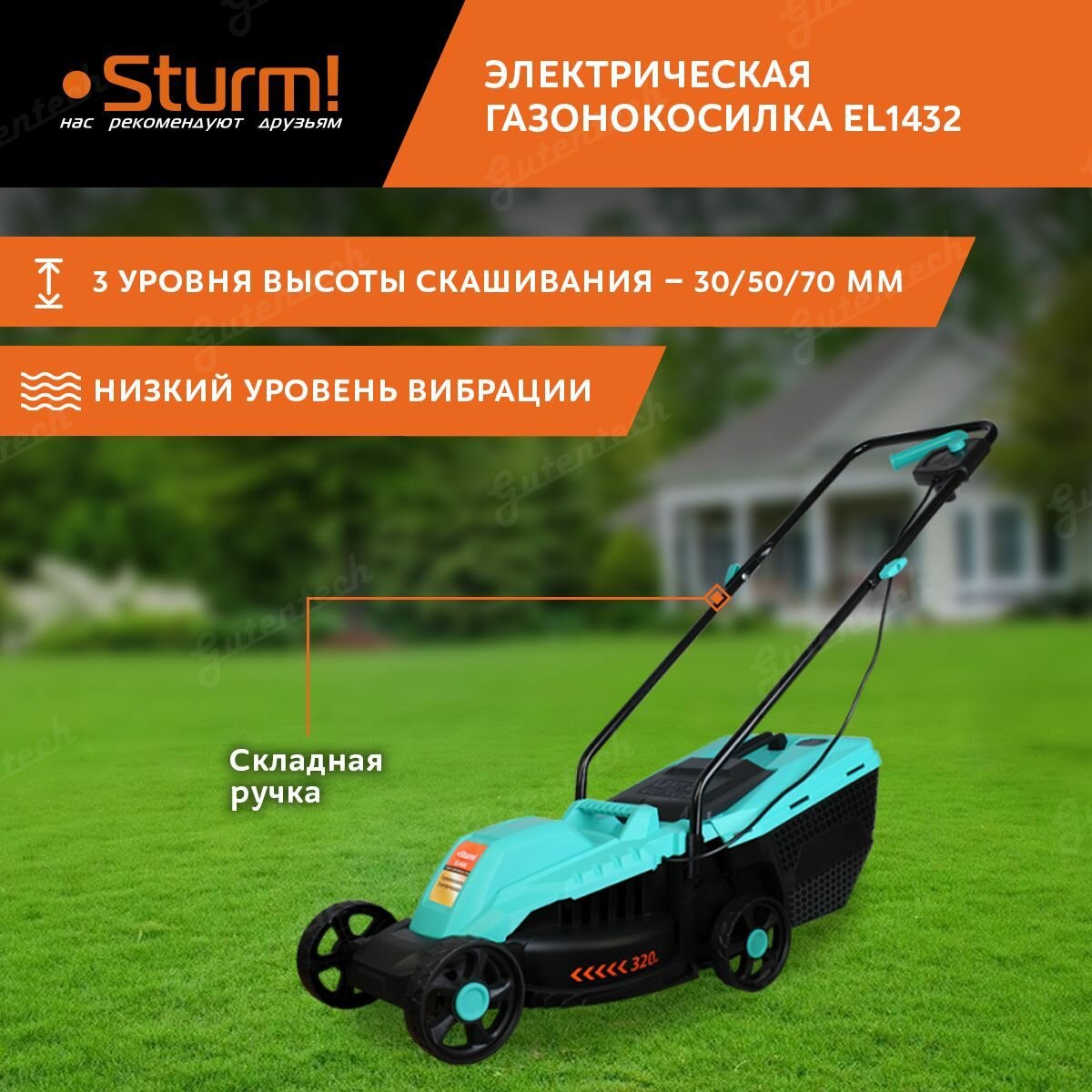STURM Газонокосилка электрическая Sturm EL1432, 1400 Вт, ширина 32 см, высота кошения 30-70 мм интересное: